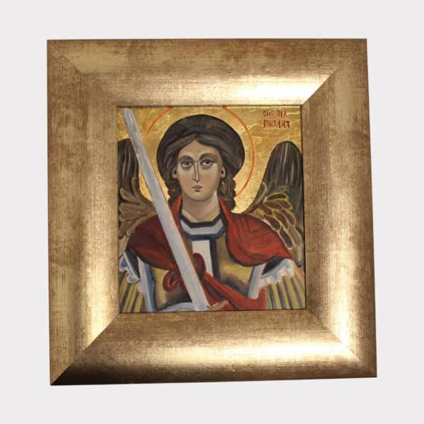 Veličanstvena Vizantijska ikona Arhangela Mihaila (25×25 cm), ručno rađena na drvenoj podlozi. Simbol nebeske zaštite, idealna za slavu (Aranđelovdan).