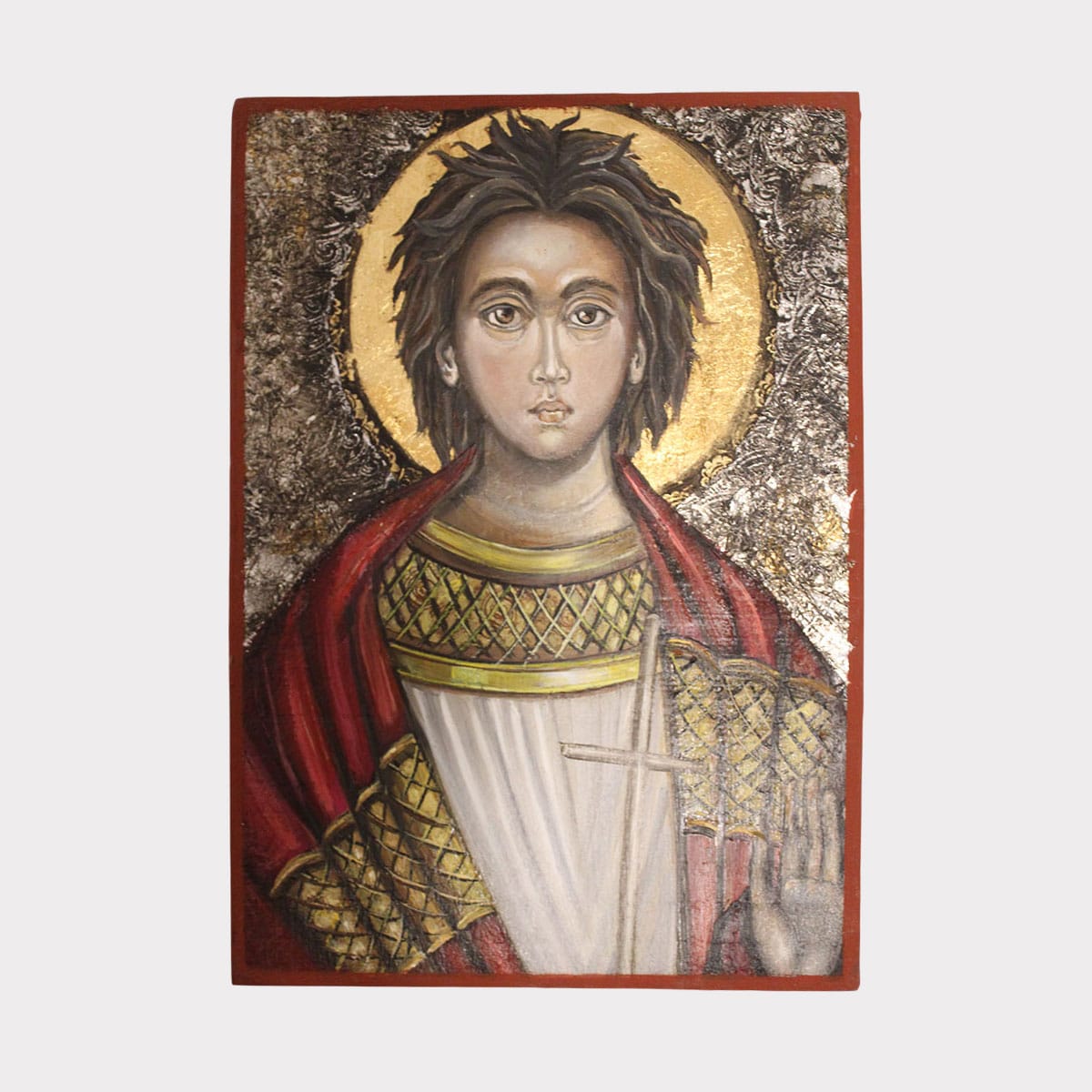 Ručno rađena Vizantijska ikona Svetog Trifuna (22×16 cm), zaštitnika vinogradara. Izrađena na drvetu po kanonima klasičnog ikonopisa. Savršeno delo za slavu (Trifundan).