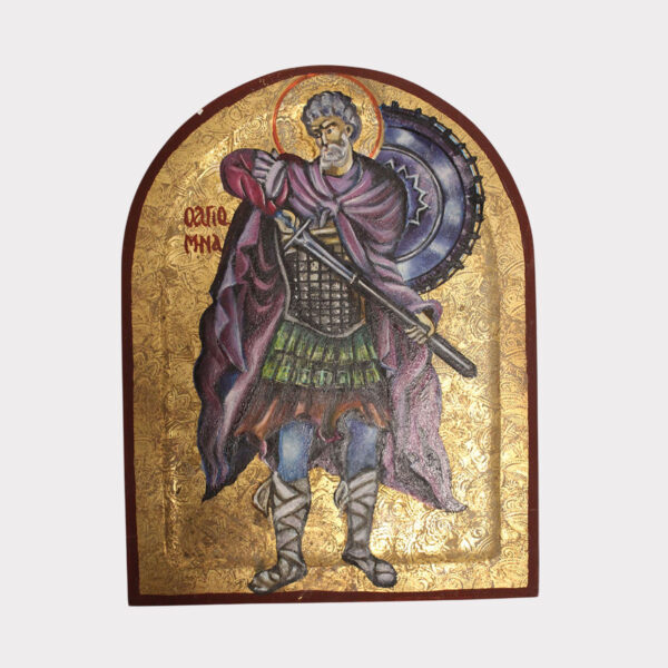 Autentična ikona Svetog Mine, zaštitnika od kradljivaca i vatre (26×20 cm). Izrađena na lipovom drvetu, ukrašena 22K zlatom, oslikana uljanim bojama u Vizantijskom stilu.